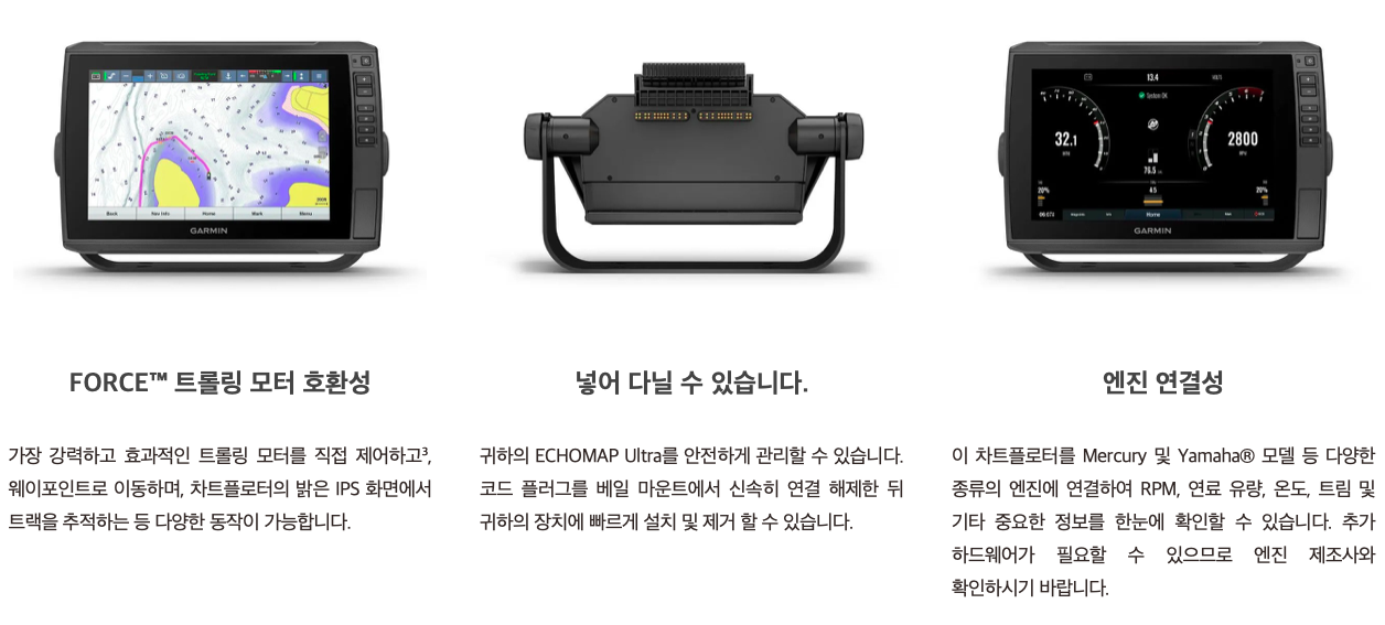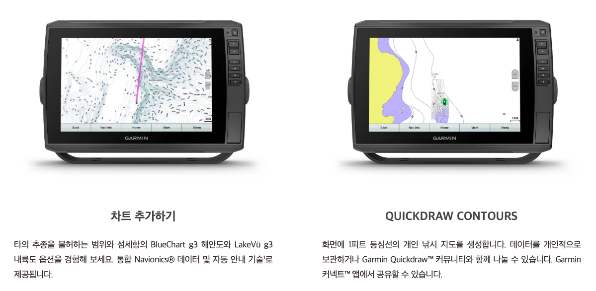 직사광선에서도 뛰어난 가독성을 보이는 10인치 & 12인치 터치스크린 차트플로터/음파 탐지 콤보를 전 세계 모든 제품의 베이스맵에 지원하고 있으며, 변환기 번들에는 초고화질 스캐닝 음파 탐지와 CHIRP 일반 음파 탐지가 추가되어 있습니다.