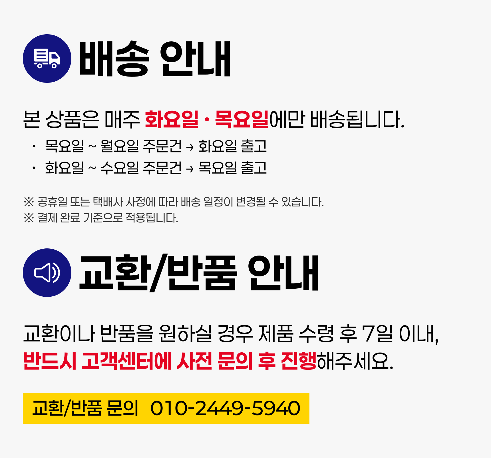 - 반품접수 기한이 지난 경우, 제품 및 패키지 훼손, 사용 흔적이 있는 제품은 교환/반품이 불가합니다.