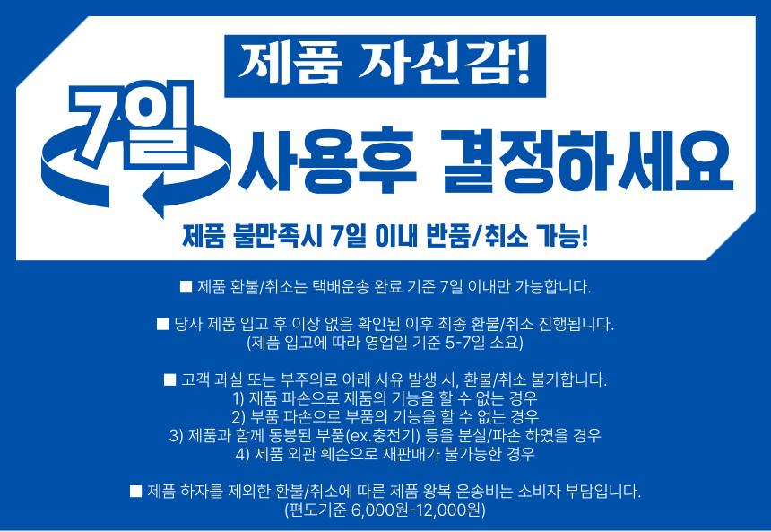 - 고객 변심으로 인한 교환/반품은 상품 수령 후 7일 이내 가능합니다.