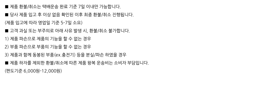 - 반품접수 기한이 지난 경우, 제품 및 패키지 훼손, 사용 흔적이 있는 제품은 교환/반품이 불가합니다.